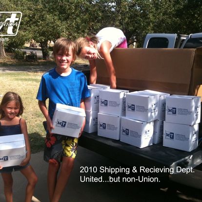 Three of Mark Solvies' six children helping out with an MT ordere that came in. You can still find them running around the office today! Milla (left), Austen (Middle), Ava (right).